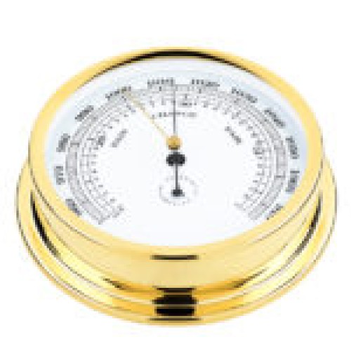 Nautical barometer with white aluminium dial, highlighted with black lettering and black pointer with gold register needle. The brass cases have been “Flash” plated with 18-karat gold using advanced brass plating technology which makes our instrument logs maintenance free.