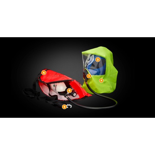 1. Unique automatic ambient air valve eliminates risk of suffocation. 2. Patented air supply system in the hood maximizes duration. 3. Two-layered hood positions the inner mask correctly. 4. Bag equipped with carrying strap. 5. Quick start system activates the unit with one pull. 6. Regulator with auto-fill system makes it easy to recharge the cylinder