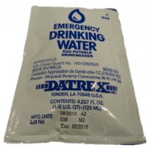 Datrex emergency drinking water, the gold standard of emergency drinking water, are individual servings of purified water, bagged in a specially designed polymer-foil pouches. This product is designed for use on LAND AND SEA in both emergency and non-emergency situations where normal supplies of water are unavailable. Areas of use: Survival at sea, land based disasters, outdoor activities (hunting, fishing, hiking, backpacking, etc.).