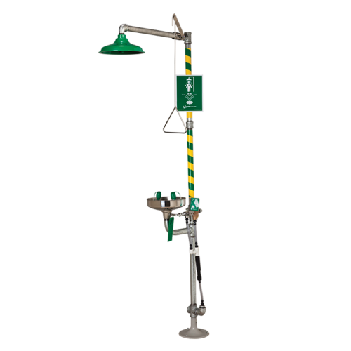 The Haws 8300.158 combines the use of a hydrodynamic ABS showerhead and anti-surge Soft-Flo eyewash heads for the irrigation process. Virtually eliminating mishaps, the unit's safety features include: pop-off eyewash dust covers, universal emergency sign, high visibility stripe, and a thermal actuator bleed valve to protect from temporary internal freezing.