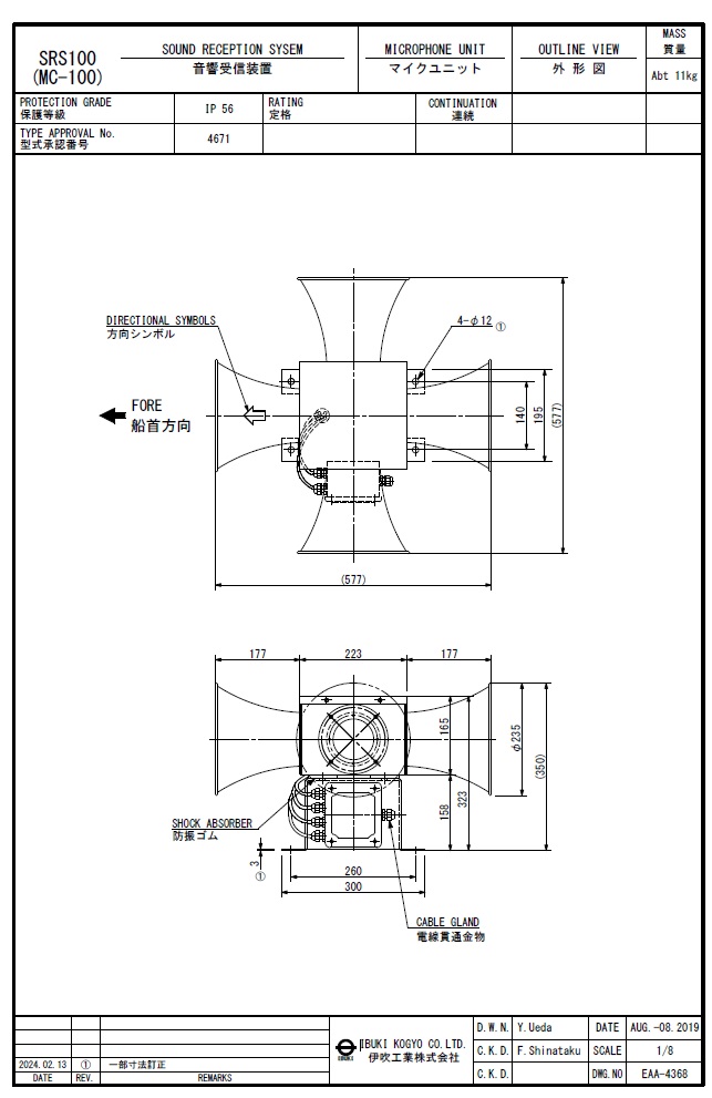 Sound reception system is mandatory equipment in accordance with the revisions to SOLAS Chapter V effected on 2002. IBUKI sound reception system is complied with the new regulation to support the maritime safety. Main function is to receive external acoustics signals, reproduce and indicate the direction on the bridge. The microphone unit is fully waterproof and durable to structure in all-weather.