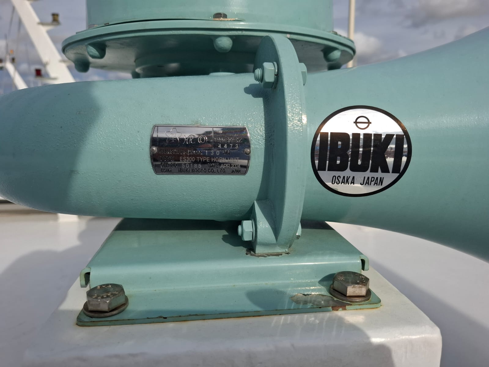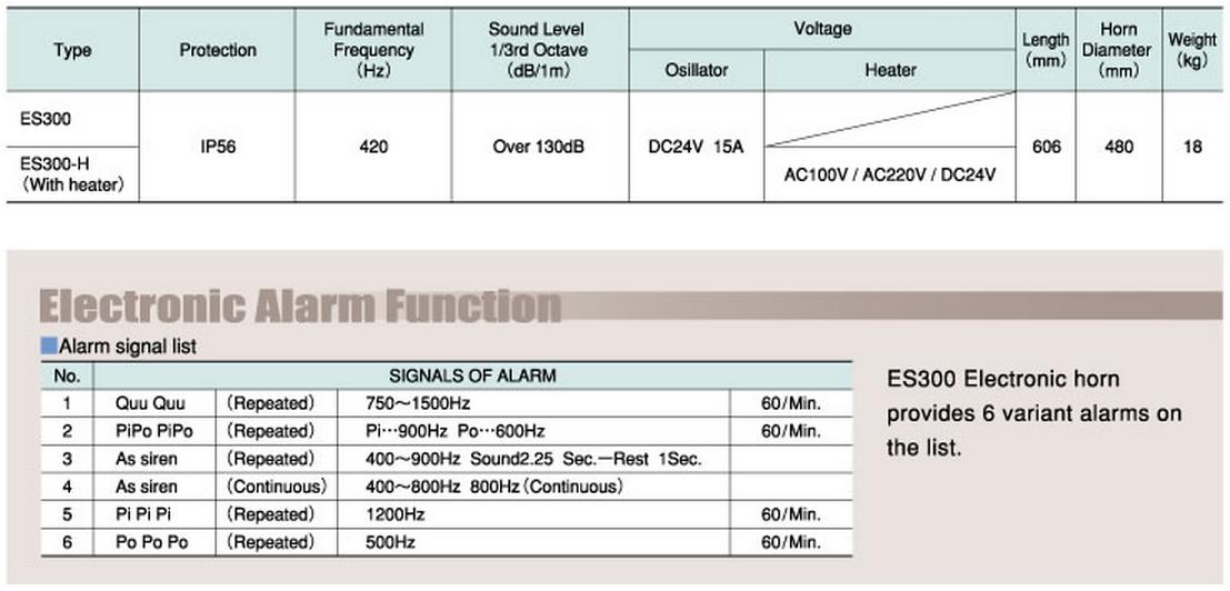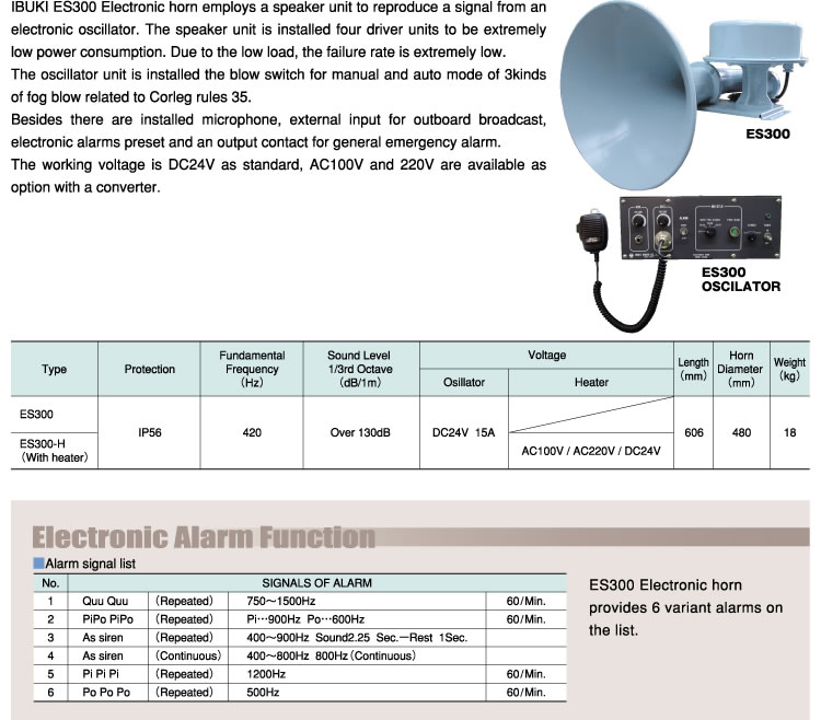 IBUKI ES300 Electronic Horn employs a speaker unit to reproduce a signal from an electronic oscillator. The speaker unit is installed four driver units to be extremely low power consumption. Due to the low load, the failure rate is extremely low the oscillator unit is installed the blow switch for manual and auto mode of 3 kinds of fog blow related to COLREG rules 35.