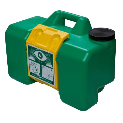 Model 7501 portable gravity operated eyewash shall include a FDA approved high-density green polyethylene 9 gallon (34.1 L) tank, ABS plastic eyewash heads with .4 gpm (1.5 L) flow rate over 15 minutes, yellow pull-down activation arm, integral handle on top, wide-fill threaded cap, sign-mounted operating instructions, and stainless steel wall bracket (unit must be hung). Additive not included – Order separately.